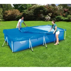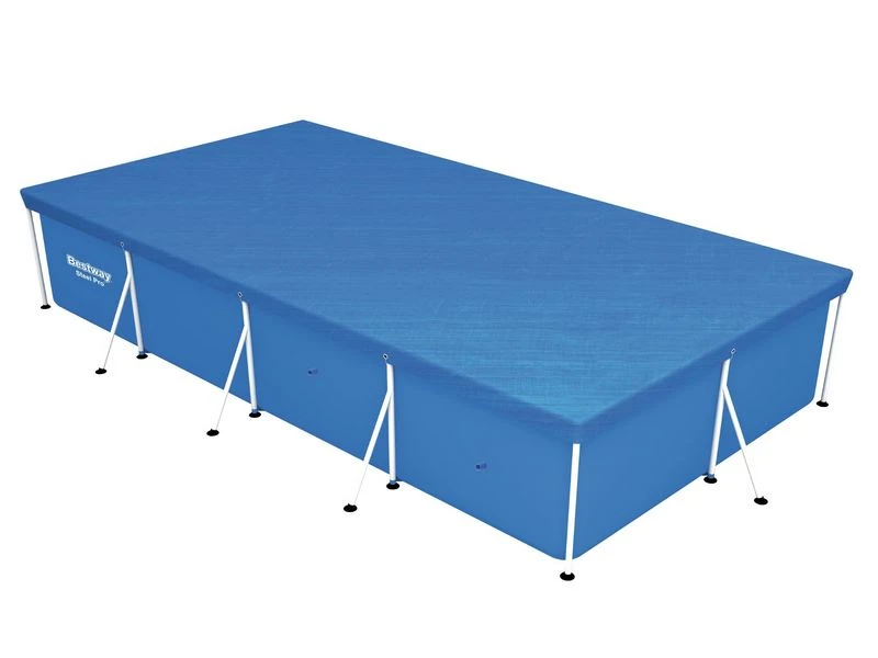 Afdekkleed voor rechthoekige zwembaden met een stalen frame. Dit kleed valt over het zwembad heen. Incl. koord om het vast te zetten. Afmeting: 410×226 cm.