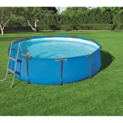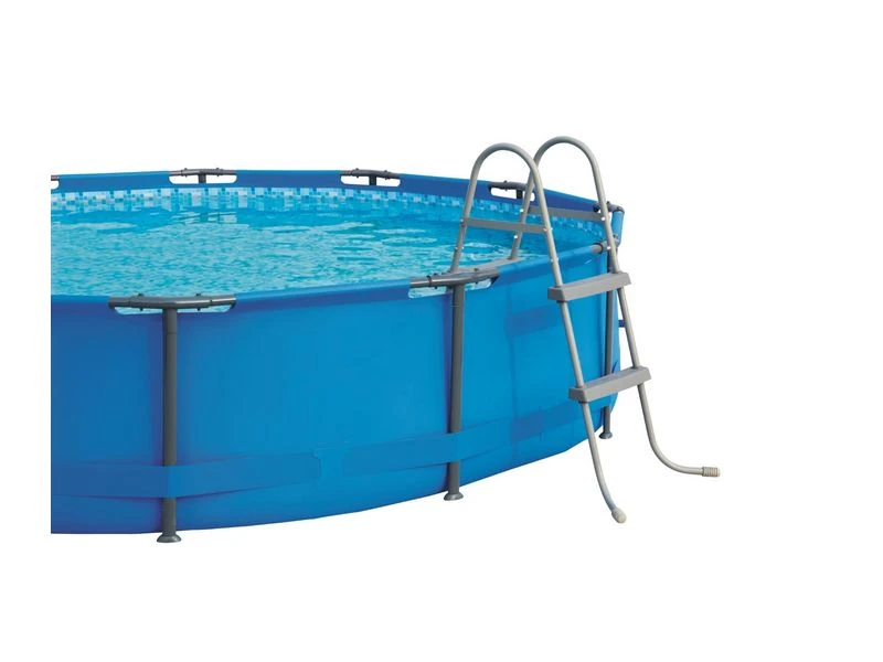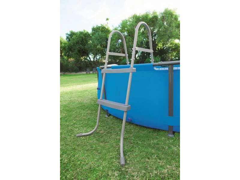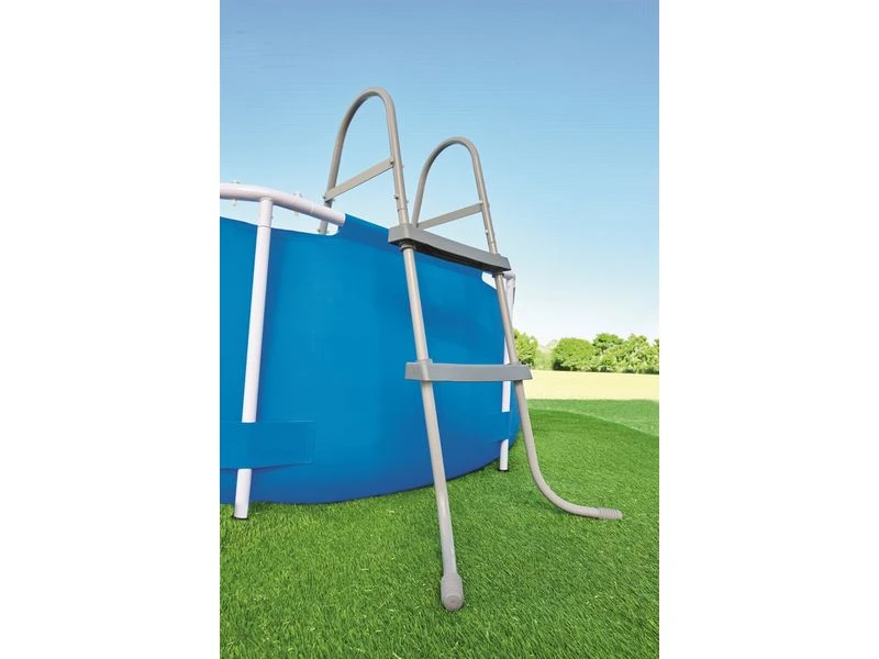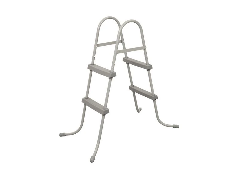 Standaard zwembadtrap. Roestwerend frame met sterke kunststof treden. Eenvoudig te monteren. 2×2 treden. Hoogte: 84 cm.