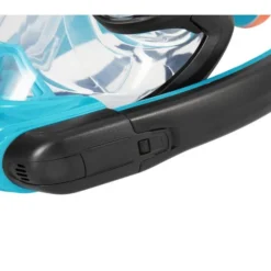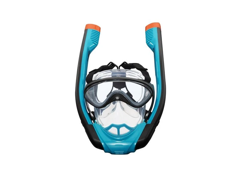Een volledig snorkelmasker met dual air flow technologie en getinte glazen. Het masker bedekt het hele gezicht en heeft 2 ingebouwde snorkels. De dual air flow technologie zorgt ervoor dat je gemakkelijk kan in- en uitademen via de neus en mond, je ademt namelijk via de ene snorkel in en via de andere snorkel uit. Daarnaast zorgt de full dry top technologie zorgt ervoor dat er geen water via de snorkel naar binnen kan komen. Met verstelbare nylon band voor de perfecte fit. Maten: Small/medium.
