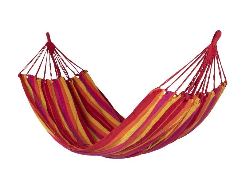 Een vrolijke en stevige hangmat. Haalt het échte vakantiegevoel naar boven! Gemaakt van stevig 320gr/m² katoen/polyester. De hangmat heeft geen spreidstok waardoor de stof zich volledig naar het lichaam vormt en minder snel kantelt, wat zorgt voor maximaal comfort. Maximaal draagvermogen: 150 kilogram.