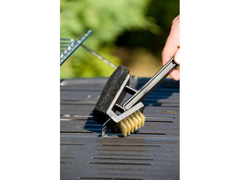 De 3 in 1 plastic roosterborstel heeft messing haren, nylon schuursponsje en een metalen krabber voor het grondig schoonmaken van je barbecue. Weken, schrobben en schrapen in één!
