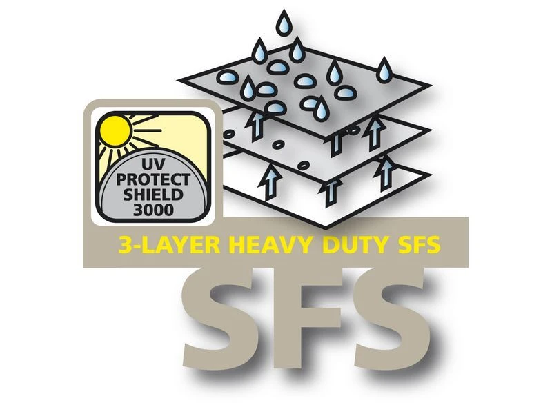 Het nieuwe SFS-3 materiaal is een optimaal waterafstotend materiaal, wat als katoen aanvoelt. Het is opgebouwd uit 3 lagen. Het materiaal is voorzien van een ademend membraan en is hierdoor nagenoeg waterdicht. Dit speciale membraan zorgt ervoor dat het materiaal een ademende eigenschap heeft, dus condenswater kan eenvoudig “verdampen”. Het materiaal is voorzien van een nieuwe UV werende coating. Hierdoor gaat de hoes langer mee.