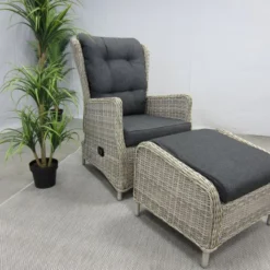 De Bombay gasveerverstelbare tuin-lounge stoel, is gemaakt van een aluminium frame met daar omheen een 6,5 mm halfrond vlechtwerkdraad in de kleur earl natural inclusief antracietkleurige zit- en rugkussens. Deze stoel wordt geleverd met voetenbank. Door de verstelling van de rug, kunt u altijd zitten op de door u gewenste manier.