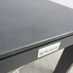 Het frame is van antraciet aluminum, het blad is van glas met daarop een antraciete coating.