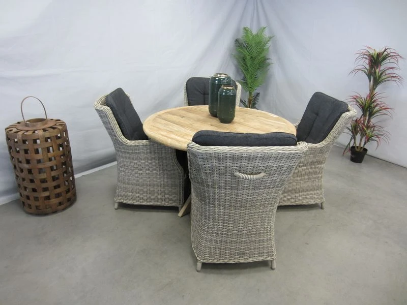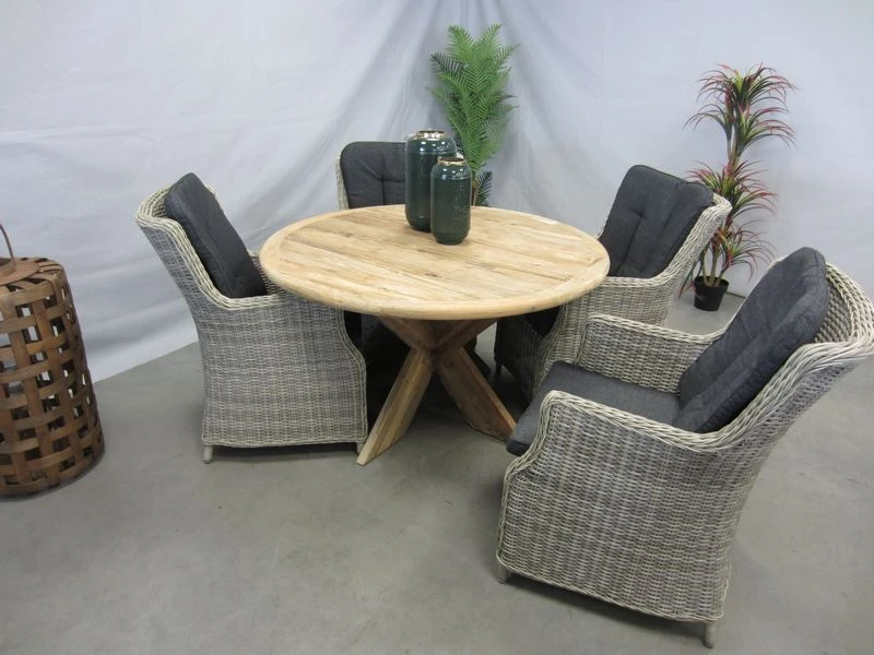 4 tuinstoelen met ronde teak tuintafel 130 cm.
