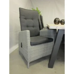 Unieke vorm van tuintafel, daardoor heeft deze set een sfeervolle uitstraling. De tuintafel derby heeft een aluminium onderstel, en een blad van teakhout. Deze tuintafel heeft daardoor een natuurlijke uitstraling. De tuinstoel is gemaakt van een aluminium frame met een gevlochten draad van kunststof. Het kussen is door het polyester materiaal kleurecht en vuil en waterafstotend.